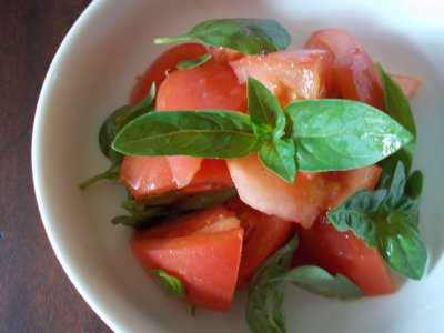 トマト,塩,コショウ,オリーブオイルとバジルたっぷり。