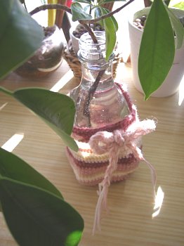 毛糸で編んだ小物入れ。