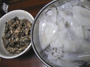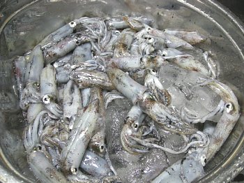 昨夜、夫が木更津で釣ってきたヒイカです。 小さくとも50杯以上もいるとかなりの量ですな。 足を取って骨を抜いた後、 夫と長女と私の3人で布巾を使って黙々と皮をむきました。 20分ほどかかってやっとこんな状態に。(↓写真左側) こりこりしてそれは美味でございました。 足と目玉を取った胴体部分は煮付けに。(写真右側) 墨が混ざったので色が悪くて一見非常にまずそうですが 意外とおいしく家族にも好評でした。 しかし、とても4人で一遍に食べきれる量ではなく 残った分は今日のお昼にお好み焼きに入れて完食いたしました。 ああ、食べ過ぎてイカんなあ