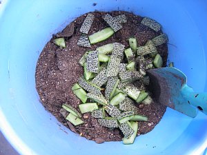 この季節には毎日でも食べたいスイカやメロンですが 困るのが皮の処理なんですよね。 そこでうちでは こんなふうに土を入れたバケツに放り込んで よく混ぜ込んでから 皮が見えなくなるように土をかぶせて処理しています。 夏だと大体1週間もすると影も形もなくなってしまいます。 イッツミラクル 土のリサイクルにもなって一石二鳥かなと。 ただ、次々入れてしまうと処理しきれないので スイカやメロンは週1回くらいでいいかなと またまた財布にもエコですね