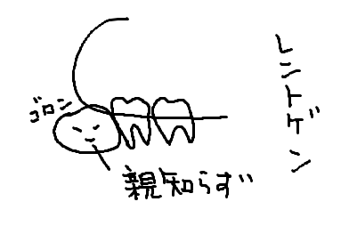 ”半分しか”というのは,大きな親知らずが肉に埋まっている上,隣の歯の下に入り込んでひっかかっているので